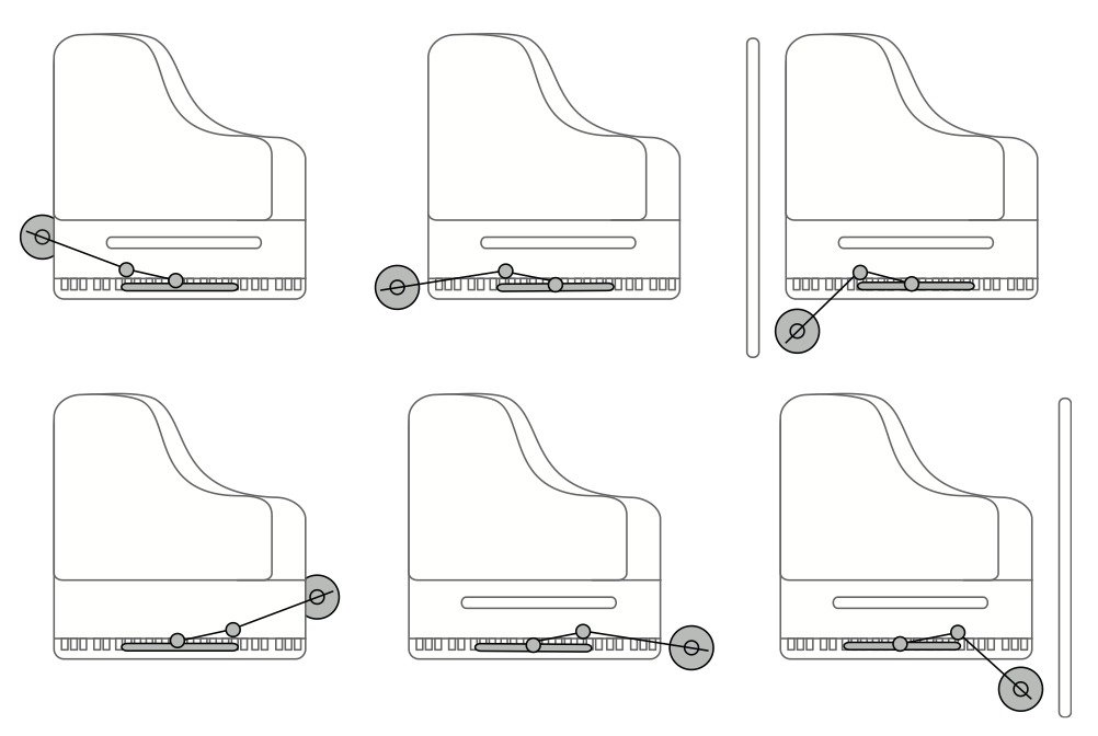 Because of this flexible design, there are several options for placing the base near a piano (see below). Note that it is important to have the lamp head as close to center as possible to achieve the most even light output. It’s also important to place the lamp head at the right height. This is very easy to do using the included paper measuring strip.