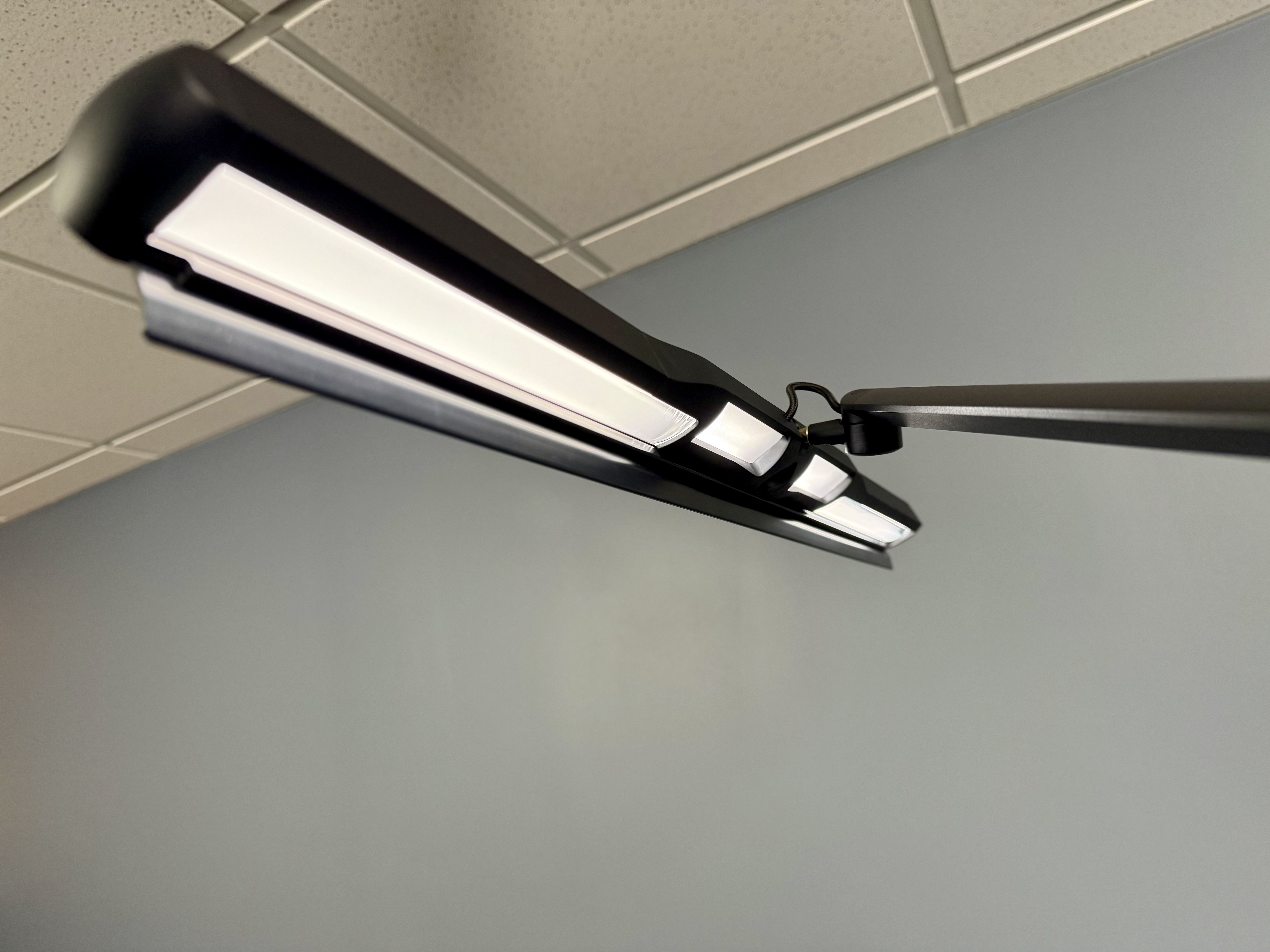 The lamp head has four lighting zones. Two are used for lighting the keyboard, and the other two are directed towards the sheet music. While the lights for the keyboard are always on when the lamp is on, the sheet music lights can be turned off independently.