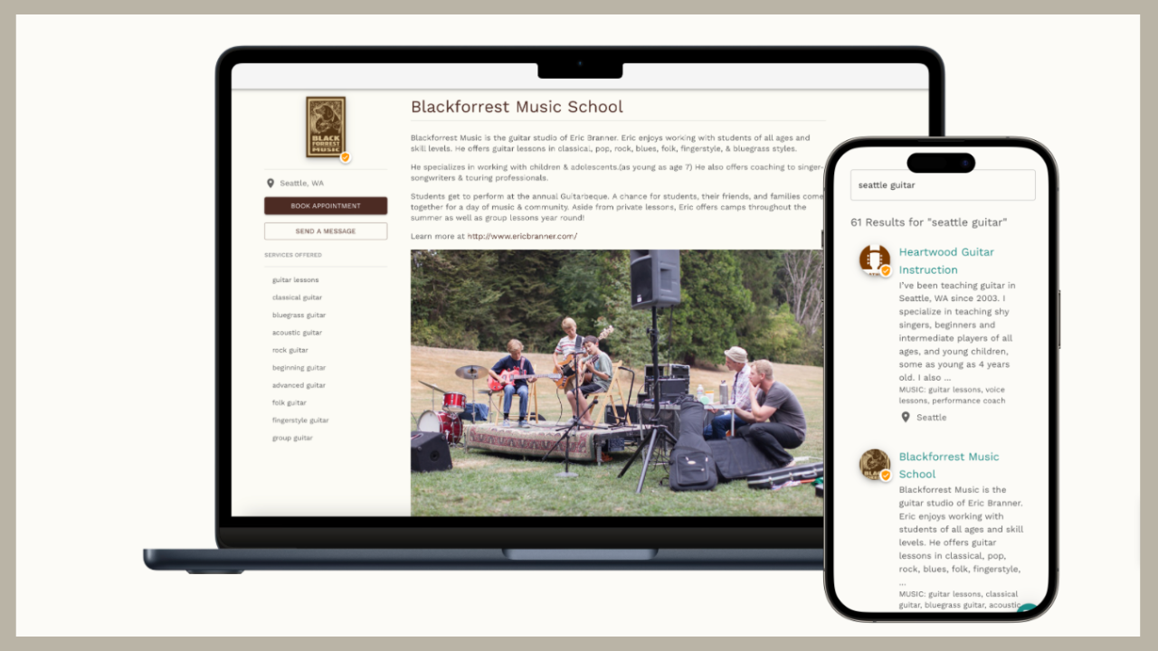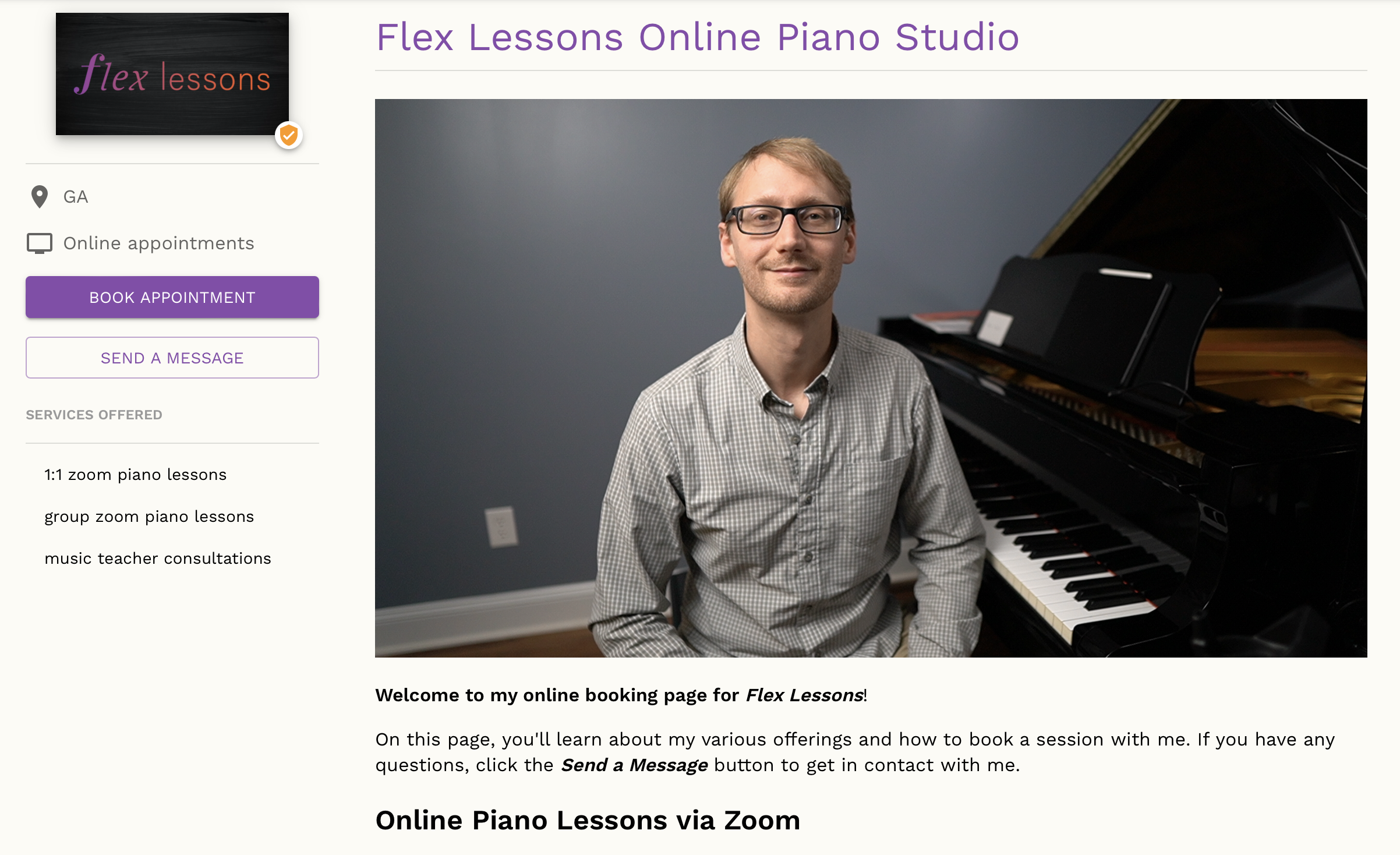 On my profile, for example, you’ll find all of the minimum setup requirements and booking instructions that one would need to be aware of when considering taking online piano lessons with me. If a person wants to learn more, I simply direct them to an information page my other website. This other page directs back to my Marketplace Profile as the main call to action.