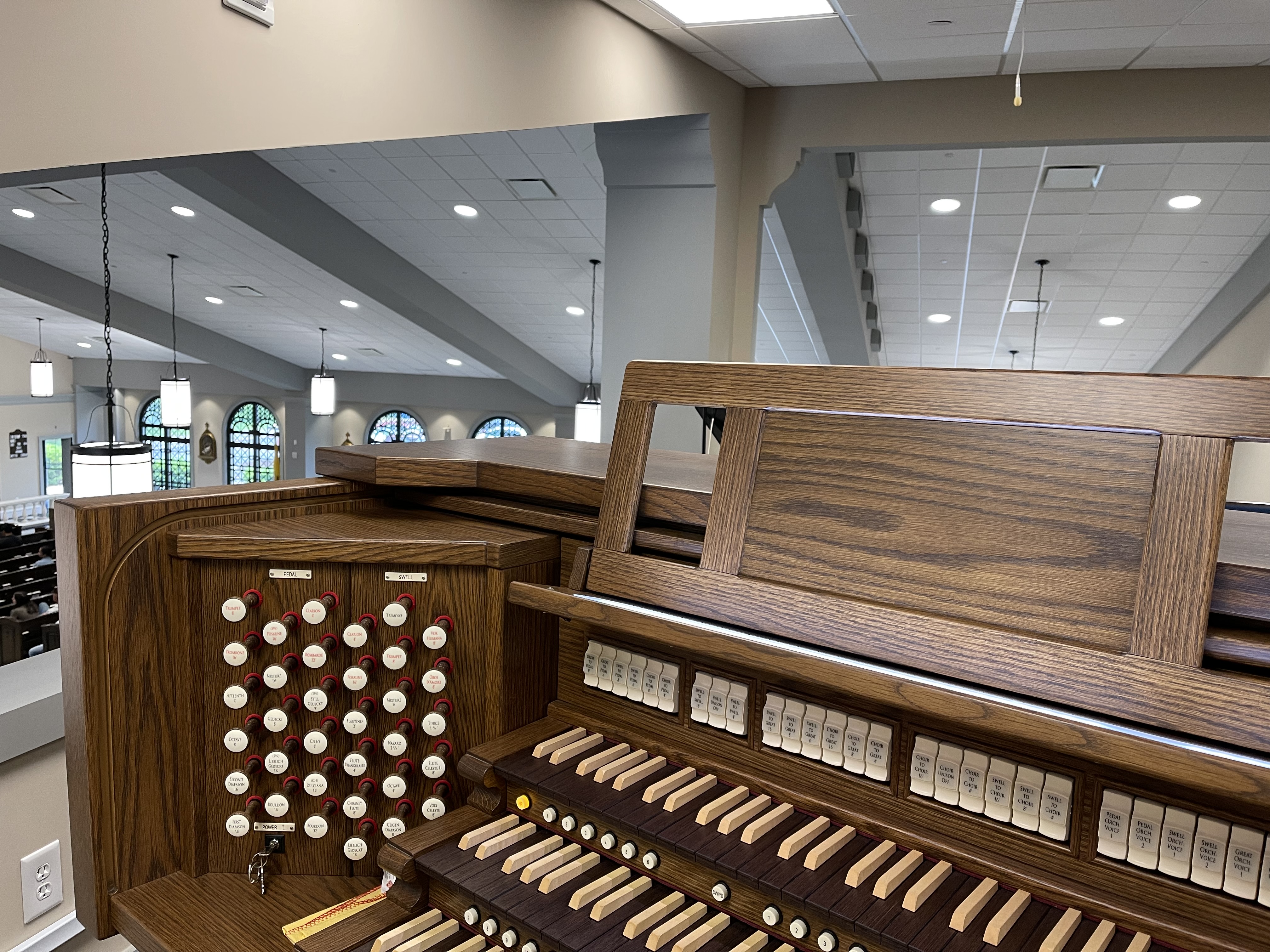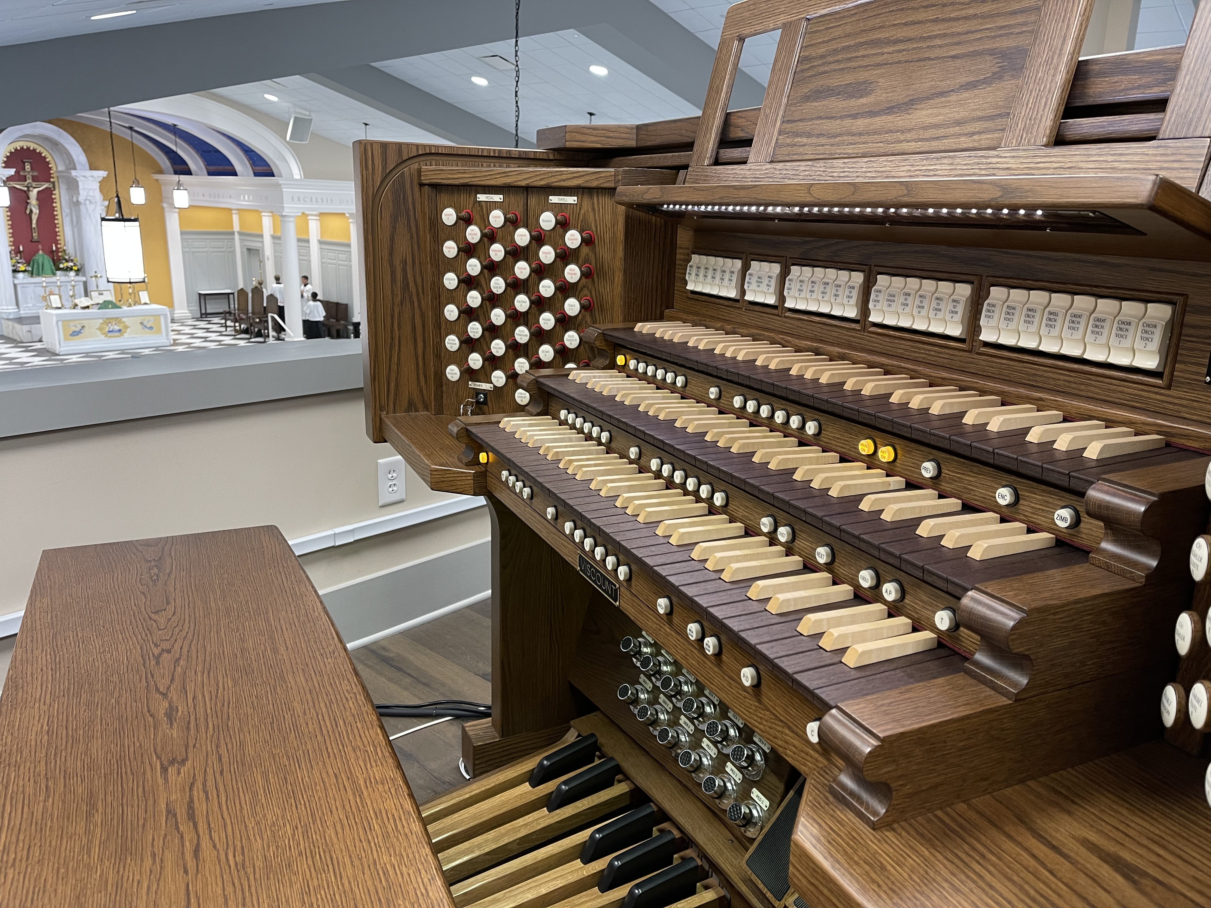 That Viscount is gorgeous, and I absolutely love the brown and creme colored key combo. It really makes the manuals look elegant. It looks like you have a good selection of stops, and I always like the look of draw knobs. How do you like the reeds?